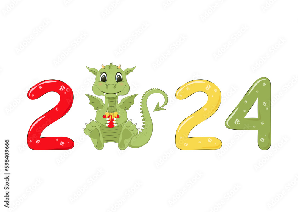Funny dragon with gifts on his head. Symbol of new year 2024